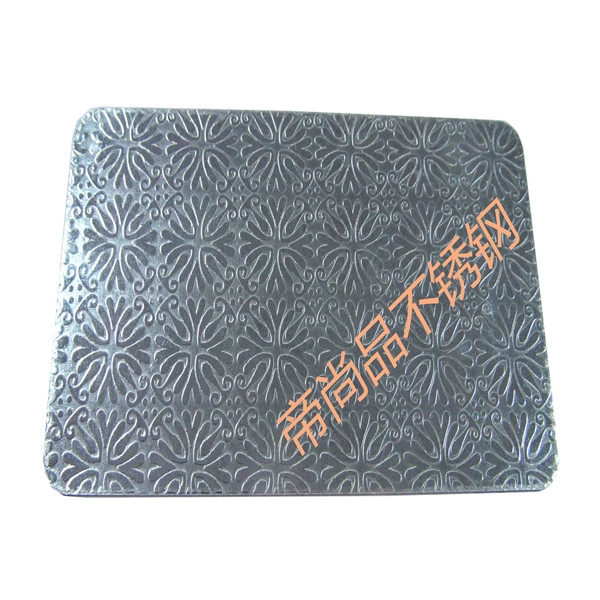 不銹鋼壓花板是在不銹鋼板表面施以凹凸的花紋,用于對光潔度和觀賞性較高的地方,是用帶有圖案的工作輥軋制的,其工作輥通常用侵蝕液體加工的,板上的凹凸深度因圖案而不同。       花紋:小米粒、珍珠米、珠光板、小方格紋、菱形方格紋、仿古方格紋、皮革紋、編織紋、斜紋、菊花紋、冰竹紋、砂光板、立方體、自由紋、石紋板、蝶戀花、編竹紋、小菱形、大橢圓、熊貓紋、歐式花紋、元寶、麻布紋、大水珠、馬賽克、木紋、萬字花、萬福臨門、如意云朵、方格紋、彩花紋、彩圓圈紋、魚鱗紋、細網紋、心形紋等。