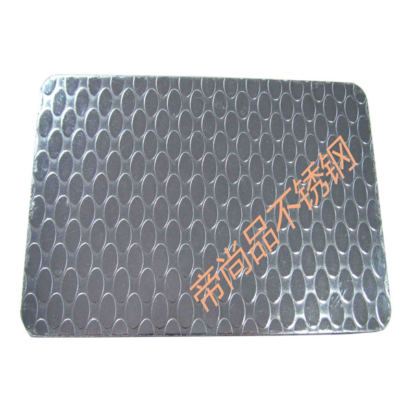 不銹鋼壓花板是在不銹鋼板表面施以凹凸的花紋,用于對光潔度和觀賞性較高的地方,是用帶有圖案的工作輥軋制的,其工作輥通常用侵蝕液體加工的,板上的凹凸深度因圖案而不同。 花紋:小米粒、珍珠米、珠光板、小方格紋、菱形方格紋、仿古方格紋、皮革紋、編織紋、斜紋、菊花紋、冰竹紋、砂光板、立方體、自由紋、石紋板、蝶戀花、編竹紋、小菱形、大橢圓、熊貓紋、歐式花紋、元寶、麻布紋、大水珠、馬賽克、木紋、萬字花、萬福臨門、如意云朵、方格紋、彩花紋、彩圓圈紋、魚鱗紋、細網紋、心形紋等。