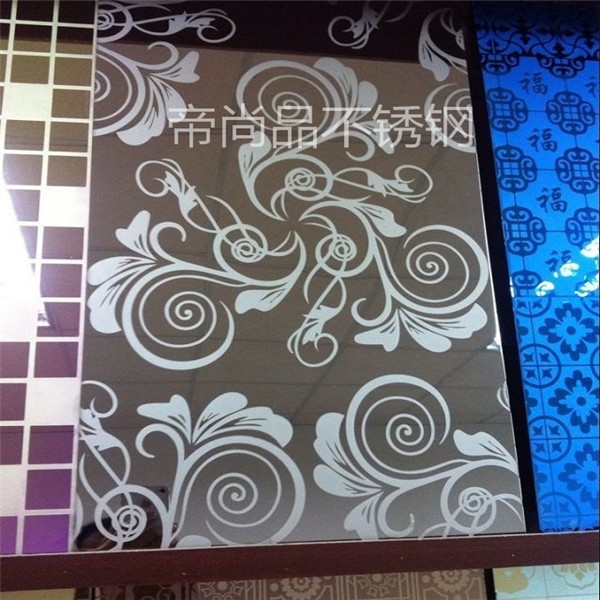 佛山帝尚品廠專業生產電梯蝕花板、局部退鈦板、高檔寶石藍衛浴板、局部手工拉絲板、高精度 8K板、不銹鋼亂紋板、不銹鋼天花板,承接異形件蝕刻加工。不銹鋼板蝕刻最大加工尺寸為1500 mm *8000 mm ,管材蝕刻最大直徑100 mm 、最大長度為6000mm。可提供8K鏡面、磨砂、水鍍著色、真空鍍著色、蝕刻花紋圖案、剪板、折彎一條龍服務。帝尚品不銹鋼采用進口感光油墨,腐蝕液,配套大型人工光源曝光,產品不發生側蝕,均勻度好,精確度高,線條最細達0.2mm,,深度最深達0.5-1.0mm。蝕刻板有電梯門花板、名種彩色不銹鋼花紋板、鏡面蝕刻、拉絲蝕刻、蝕刻鈦金、先蝕刻再鍍色、先鍍色再蝕刻等多種工藝組合。咨詢熱線:18025870558周先生