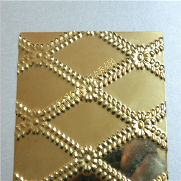 不銹鋼壓花板是在不銹鋼板表面施以凹凸的花紋,用于對光潔度和觀賞性較高的地方,是用帶有圖案的工作輥軋制的,其工作輥通常用侵蝕液體加工的,板上的凹凸深度因圖案而不同。       花紋:小米粒、珍珠米、珠光板、小方格紋、菱形方格紋、仿古方格紋、皮革紋、編織紋、斜紋、菊花紋、冰竹紋、砂光板、立方體、自由紋、石紋板、蝶戀花、編竹紋、小菱形、大橢圓、熊貓紋、歐式花紋、元寶、麻布紋、大水珠、馬賽克、木紋、萬字花、萬福臨門、如意云朵、方格紋、彩花紋、彩圓圈紋、魚鱗紋、細網紋、心形紋等。