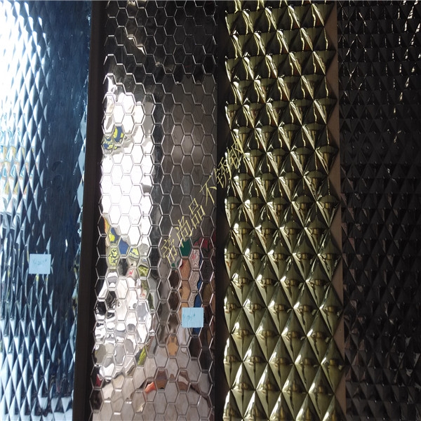 不銹鋼壓花板是在不銹鋼板表面施以凹凸的花紋,用于對光潔度和觀賞性較高的地方,是用帶有圖案的工作輥軋制的,其工作輥通常用侵蝕液體加工的,板上的凹凸深度因圖案而不同。       花紋:小米粒、珍珠米、珠光板、小方格紋、菱形方格紋、仿古方格紋、皮革紋、編織紋、斜紋、菊花紋、冰竹紋、砂光板、立方體、自由紋、石紋板、蝶戀花、編竹紋、小菱形、大橢圓、熊貓紋、歐式花紋、元寶、麻布紋、大水珠、馬賽克、木紋、萬字花、萬福臨門、如意云朵、方格紋、彩花紋、彩圓圈紋、魚鱗紋、細網紋、心形紋等。